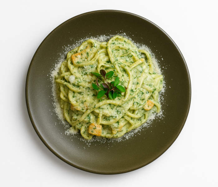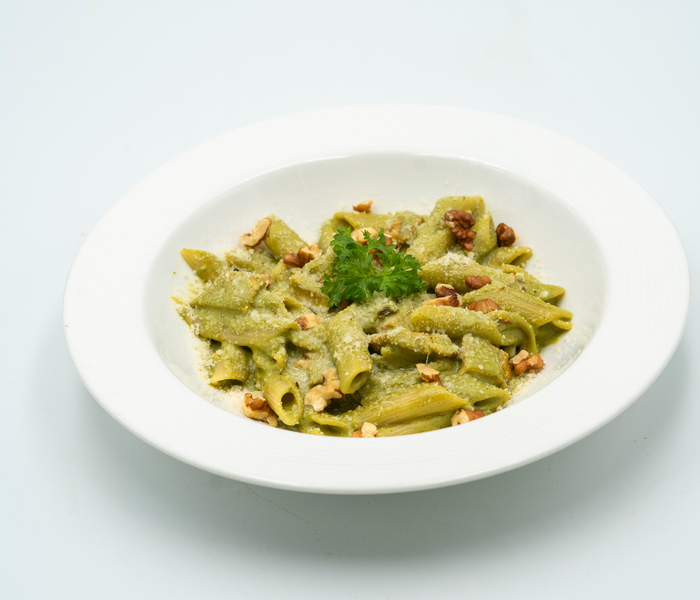 اسپاگتی . سس ریحان . شنیتسل مرغ گریل شده . پسته خرد شده و پنیر پارمسان