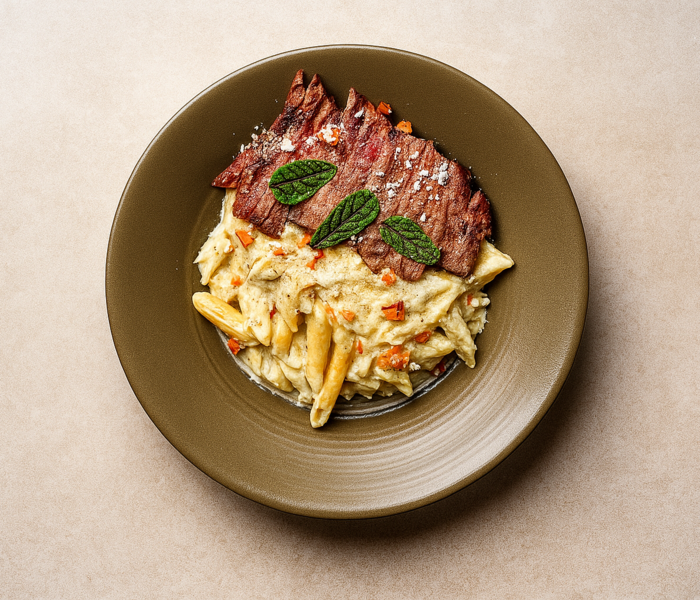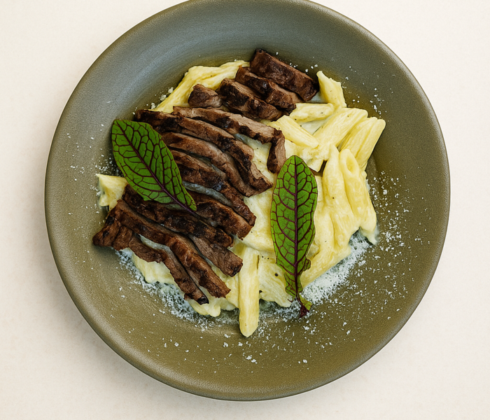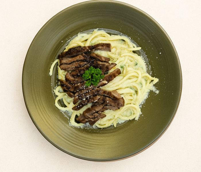 اسپاگتی . سس خامه . فیله گوساله گریل شده . جعفری خرد شده وپنیر پارمسان