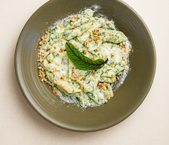 پنه . سس خامه . اسفناج . فیله گوساله گریل شده . گردو خرد شده و پنیر پارمسان