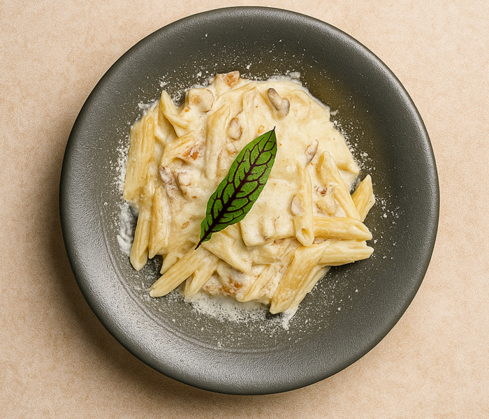 پنه . بادمجان کبابی . سس خامه . قارچ . گردو خرد شده و پنیر پارمسان
