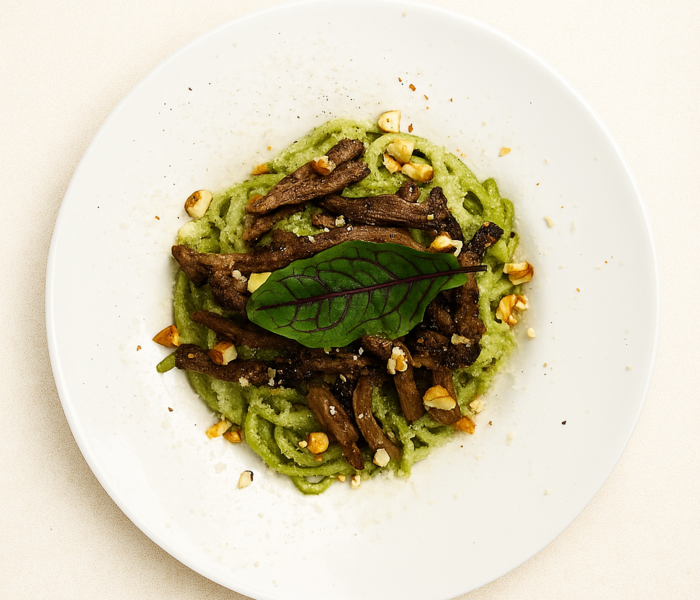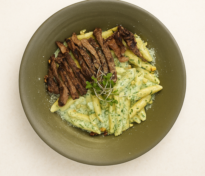 اسپاگتی . سس ریحان . فیله گوساله گریل شده . پسته خرد شده و پنیر پارمسان