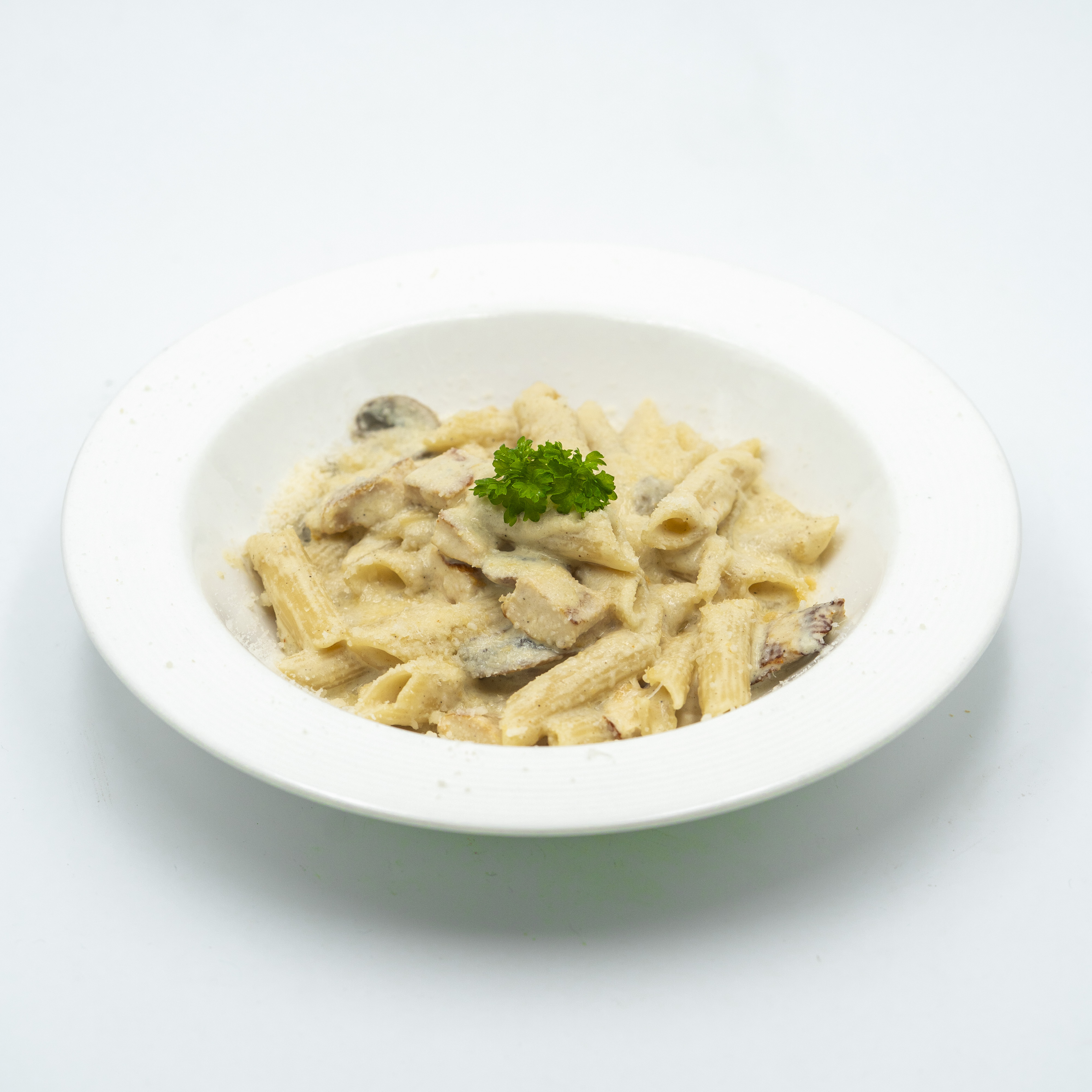 پنه . سس خامه . شنیتسل مرغ گریل شده . قارچ . پنیر پارمسان