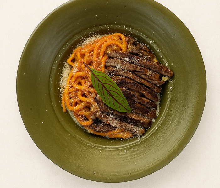 اسپاگتی . سس گوجه . فیله گوساله گریل شده . ریحان و پنیر پارمسان