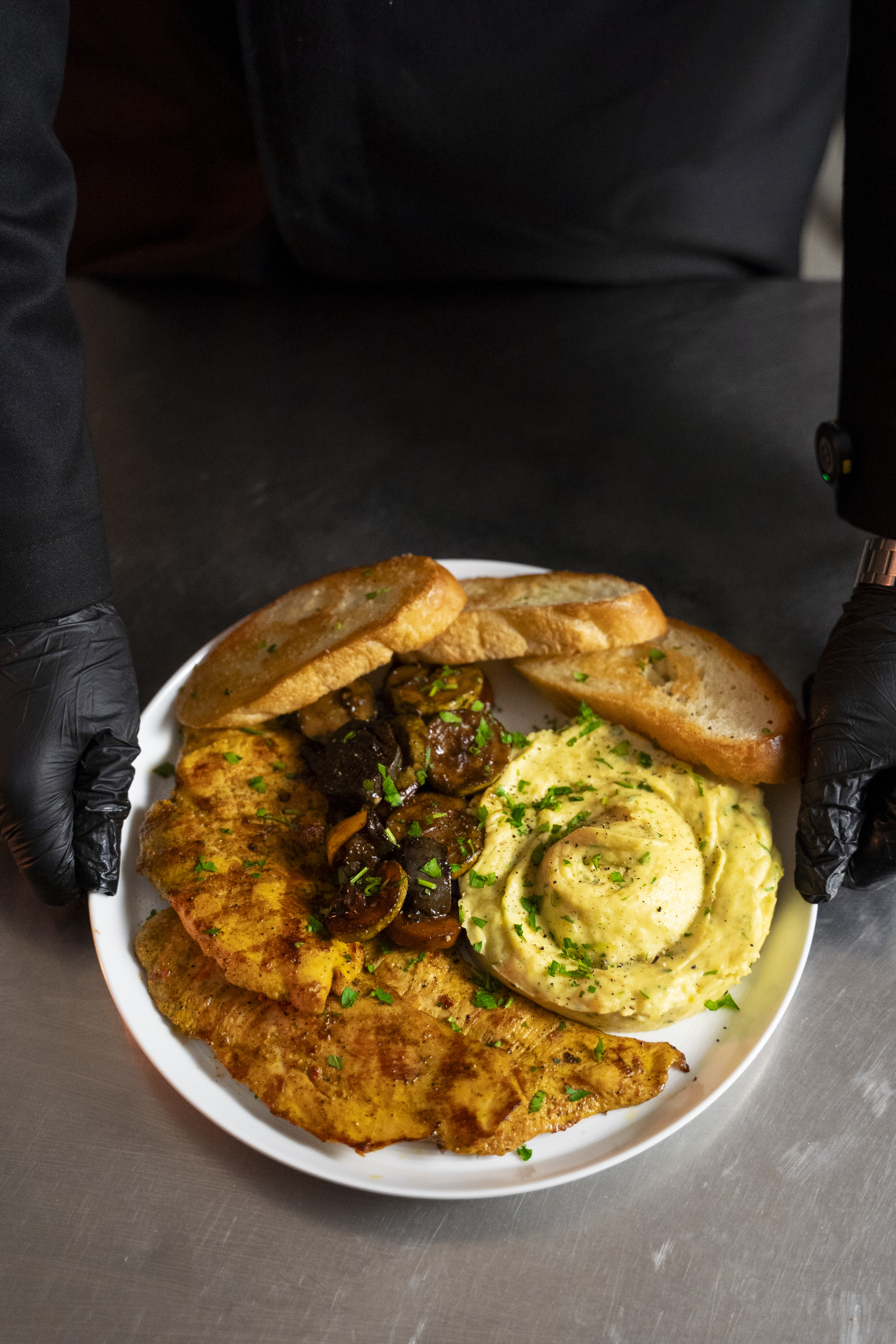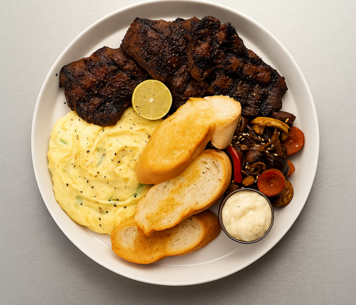 فیله گوساله گریل شده . پوره سیب زمینی . نان سیر . سبزیجات پخته . سس قارچ و خامه